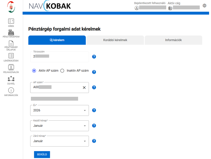 Válassza ki, hogy aktív vagy már inaktív pénztárgép adatát szeretné lekérni! A rendszer alapértelmezetten az Aktív AP szám opciót jelöli ki.