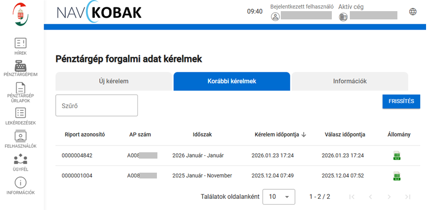 A kérelem benyújtása után automatikusan a Korábbi kérelmek lapra lép a rendszer.